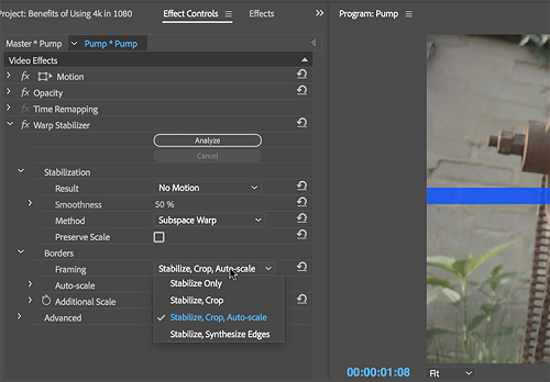 هنگامی که شما از افکت Warp Stabilizer استفاده می کنید، به طور خودکار کلیپ شما را تثبیت می کند، برش و مقیاس می دهد. این کار باعث می شود که فیلم را طوری تنظیم کند که نمی توانید لبه های برش قاب را ببینید. زیبایی جریان کاری 4k تا 1080p این است که شما می توانید فیلم های خود را در داخل یک دنباله 4k native, تثبیت کنید و سپس آن را درون دنباله 1080p قرار دهید. این کار از نمایش دادن لبه های بریده شده جلوگیری می کند. (در زمان انتشار، شما می توانید فیلم ها را فقط در Premiere Pro تثبیت کنید اگر رزولوشن کلیپ با توالی منطبق باشد.)