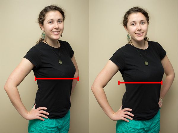 شما میتوانید با بلند کردن دست ها به اندازه 1 الی 2 اینچ آن را اصلاح کنید، بنابراین در حالت " شناور " قرار می گیرند و دیگر فشاری وارد نمی کنند. متناوبا ، شما میتوانید دست آنها را طوری قرار دهید که بازو در یک موقعیت متفاوت باشد ، مانند قرار دادن دست روی باسن. در تصویر بالا ، خط قرمز نشان دهنده سایز دست هنگام ایستادن است. همان خط قرمز به سمت عکس دوم منتقل شد تا بتوانید ببینید که وقتی دست را به بدن فشار ندهید، بازو چقدر کوچکتر میشود .