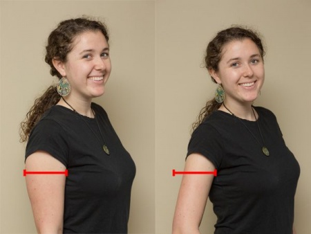 وقتی مردم به طور طبیعی میایستند ، یک کار دیگر که آنها انجام میدهند این است که با بازوهای خود در کنار یکدیگر قرار بگیرند. این حالت باعث مشکلات متعددی میشود. اول اینکه باعث میشود آنها غیر ماهر و معذب به نظر برسند. دوم ، بازوی آنها به تنه شان فشار میآورد. این حالت بازو را بیرون میدهد و باعث میشود که بزرگتر از آن چیزی باشد که واقعا ًهست.