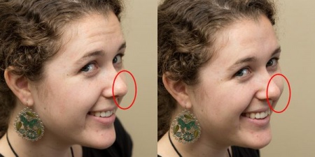 اگر سوژه بیش از حد دور شود و بینی از این خط عبور کند ، " منحنی طبیعی صورت" را میشکند. این افکت "Pinocchio" را ایجاد می کند و باعث می شود طول بینی گسترش پیدا کند. شما می توانید با چرخاندن آنها کمی به سمت خودتان تا زمانی که بتوانید یک فاصله کمی بین پایان بینی و یک طرف چهره را ببینید، از این حالت جلوگیری کنید. شما نمیخواهید آن خط را بشکنید و یا باعث شود به نظر برسد که چهره یا سیمای نا متناسب دارند.