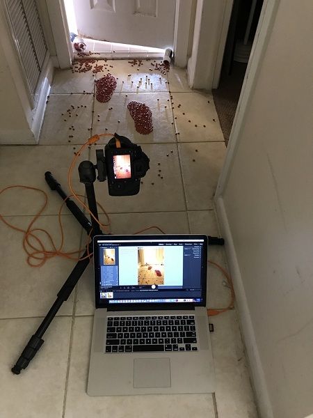 هنگامی که اولین صحنه فیلمبرداری شد ، من به همراه دوربینم (دوربین کانن 5d Mark 3 با یک لنز واید) ، یک سهپایه ، کامپیوتر من و یک لامپ LED کم نور در حمام چهار فوتی بودم. بعد از ۸ ساعت متوالی، پنج صحنه متفاوت ساختم و صدها عکس گرفتم. تمیزکاری خانه واقعا کار سختی بود، وقتی در این آشفتگی گیر افتادید، بیرون اومدن از آن کار بسیار سختی است.