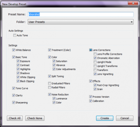 در قسمت preset name نام پریست را مینویسیم و در قسمت folder نام پوشه ای که میخواهیم پریست زیر مجموعه آن قرار گیرد.در قسمت settings میتوان تیک ویژگی هایی که لازم نداریم را برداریم و در آخر دکمه create میفشاریم.