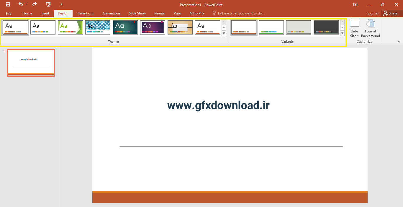 برای اینکه از تم پیشفرض استفاده نمایید میتوانید به تب design و گروه themes ها بروید . گروهی از تم پاورپوینت را مشاهده مینمایید . یکی از انها را انتخاب کنید و تغییرات دلخواه( رنگ ، چیدمان و ...) را روی آن اعمال نمایید .