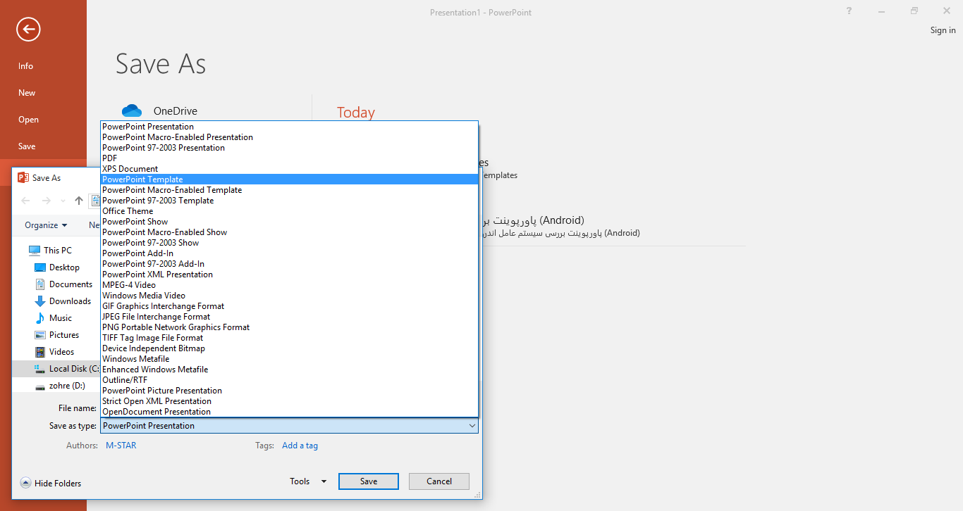 در لیست فرمت های ذخیره ، گزینه PowerPoint Temple را انتخاب کنید و سپس روی ذخیره کلیک کنید .