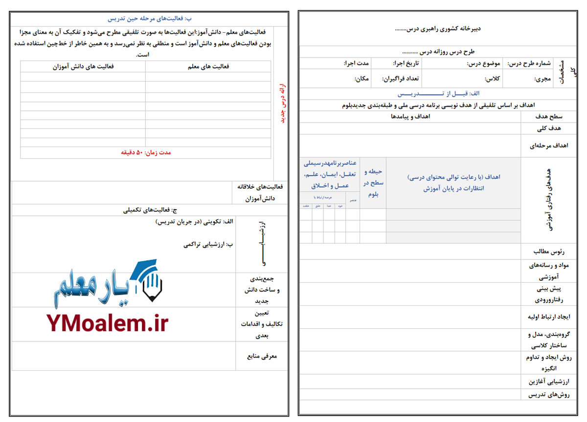 نگارش طرح درس میتواند به صورت روزانه، ماهانه یا سالانه انجام شود و معلمان میتوانند فرمهای خام آن را از سایت Ymoalem.ir دانلود کنند.