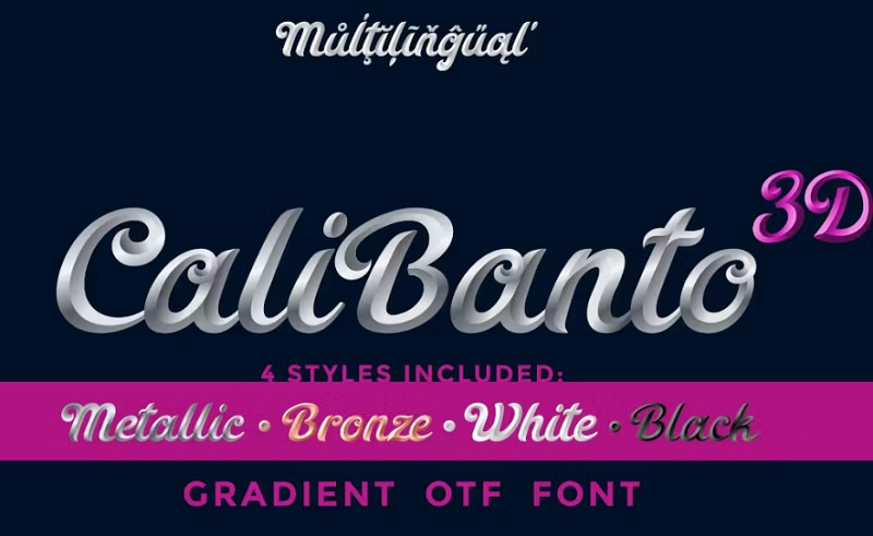 این فونت سه بعدی انگلیسی با نام CaliBanto 3D یک فونت سه بعدی با خط خوشنویسی است که در 4 سبک ارائه شده است از جمله: فلزی، برنز (کمتر براق از فلز)، سفید و سیاه. مناسب برای انواع طراحی های گرافیکی می باشد.