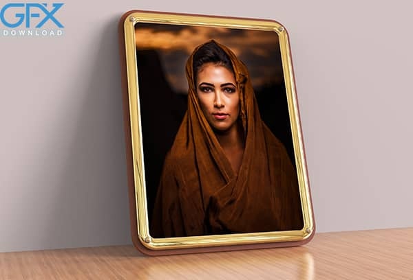 دانلود رایگان قاب عکس با فریم طلایی لایه باز روی سطح چوبی