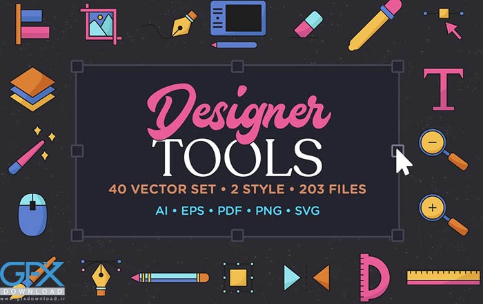 40 مجموعه آیکون از ابزارهای طراحی در قالب وکتور، که 203 فایل در مجموع می باشند. این 40 آیکون ابزار طراحی شامل بسیاری از نمادهای ابزار محبوب برنامه مانند تراز، برش، انحنا، برگه طراحی، پاک کن، قطره چکان، دسته، لایه، چوب جادویی، ماوس، قلم مو، قلم، مداد، مستطیل، بازتاب، خط کش، نوع، بزرگنمایی، ابزار کوچک نمایی ، و غیره است. شامل 20 مجموعه، هر کدام در 2 نسخه: رنگ پر شده و outlined شده است.
