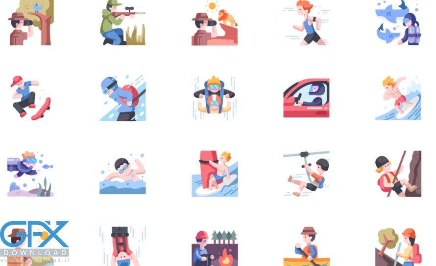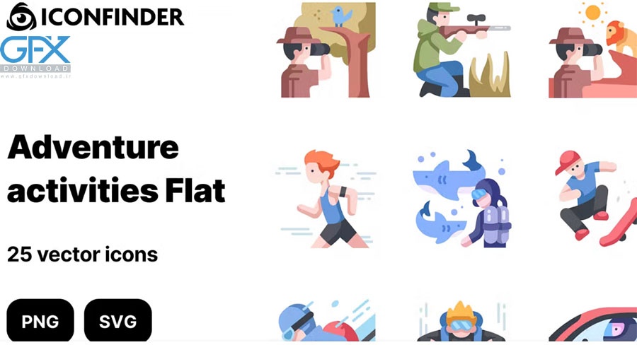 این مجموعه از فعالیت های ماجراجویی و بسته آیکون به سبک فلت می باشد که شامل 25 آیکون است. دانلود آیکون فعالیت های ماجراجویی Adventure activities با فرمت های SVG, PNG ارائه شده است. طرح ها شامل: ورزش، ماجرا، مفرط، طبیعت، در فضای باز، مسافرت رفت، اب، طناب، فعالیت، حیات وحش، جنگل، چتر نجات، غواصی، دوربین دوچشمی، دریا می باشد.