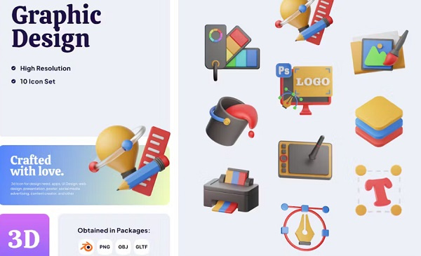 مجموعه 10 آیکون سه بعدی طراحی گرافیکی یا گرافیک دیزاینر