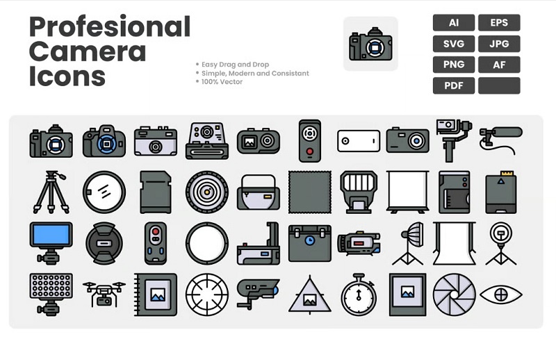 اگر به دنبال دانلود آیکون های عکاسی و فیلمبرداری برای طراحی و ادیت هستید، استفاده از یک مجموعه آیکون دوربین عکاسی حرفه ای می تواند کیفیت پروژه های گرافیکی شما را چند برابر کند. این آیکون ها با طراحی استاندارد و جزئیات دقیق، انتخابی مناسب برای طراحان گرافیک، تولیدکنندگان محتوا، رابط کاربری سایت ها و اپلیکیشن ها هستند. آیکون های مرتبط با عکاسی به شما کمک میکنند جلوه ای حرفه ای تر به طرح های خود بدهید. با دانلود این مجموعه، میتوانید در پروژه های چاپی و دیجیتال، از آیکون هایی هماهنگ و قابل ویرایش استفاده کنید.