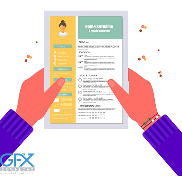 قالب اینفوگرافیک رزومه یک برگه رزومه ای که در دست یک شخص گرفته شده است. رزومه شیک برای مصاحبه شغلی. در این طرح لایه باز اینفوگرافیک شاهد قالب رزومه کاری و تحصیلی می باشید که با فرمت های EPS و JPG بر روی سایت جی اف ایکس دانلود برای دانلود قرار گرفته است. می توانید این قالب آماده را در نرم افزار ایلاستریتور یا نرم افزارهایی با قابلیت وکتور باز کرده و با متن و تصاویر دلخواه خود به راحتی جایگزین و ویرایش کنید. فقط در چند دقیقه کوتاه با استفاده از دانلود فایل اینفوگرافیک رزومه CV ، رزومه خلاقانه خود را بسازید.
