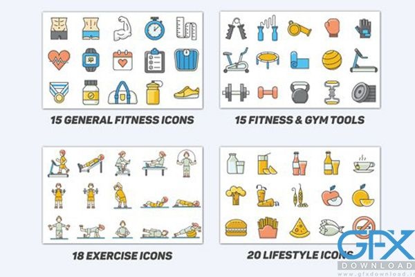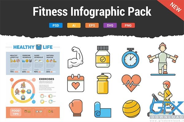 دانلود اینفوگرافی ورزش لایه باز با نام Fitness Infographic Pack. در این پست به اینفوگرافی های ورزشی و مجموعه اینفوگرافیک های ورزشی و تناسب اندام می پردازیم! شامل 3 اینفوگرافیک آماده و از قبل طراحی شده که دارای 68 آیکون تناسب اندام و سلامتی است. این نمادها در فرمت های PSD ، AI ، EPS ، SVG و PNG (در 256 پیکسل و 512 پیکسل) در دسترس هستند. همه چیز در این طرح لایه باز اینفوگرافی به طور مرتب سازماندهی شده است! در اینجا مجموعه ای از نمادهای سالم شامل: تردمیل ، پیلاتس ، تشک یوگا ، دستکش بوکس ، مکمل های غذایی ، قدرت عضلات ، هالتر ، ترامپولین ، تمرینات ، برنامه ، توقف مصرف سیگار ، کلم بروکلی ، چای سبز ، آب پرتقال و موارد دیگر در زمینه های سبک زندگی ، تناسب اندام ، زندگی سالم و تغذیه است. برای دانلود و مشاهده تصاویر نمونه به ادامه مطلب مراجعه کنید.
