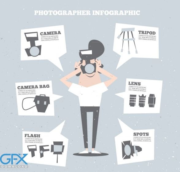 فایل آماده اینفوگرافیک عکاسی از کاراکتر یک عکاس کارتونی. وکتور مجموعه عناصر اینفوگرافیک عکاسی با نام Funny photographer مناسب انواع تبلیغات و طراحی های گرافیکی می باشد. این طرح وکتور است و با فرمت های AI , EPS و JPG ارائه می شود.