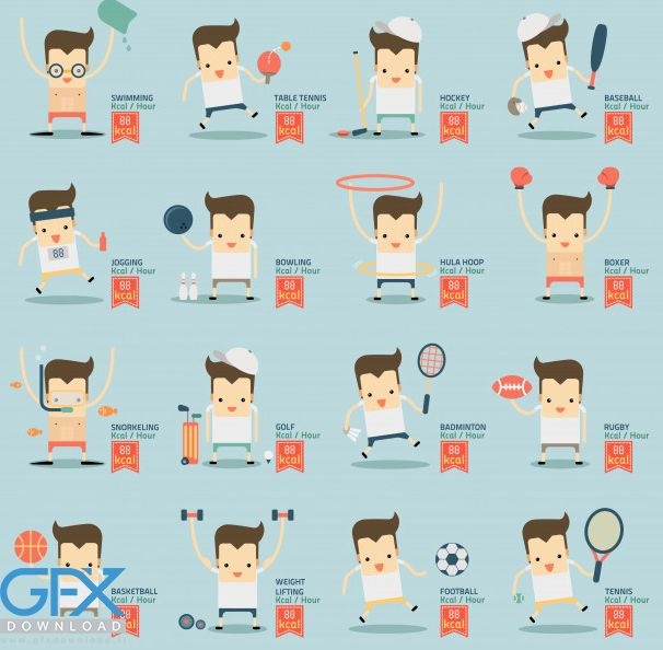دانلود اینفوگرافیک حرکات ورزشی از طرح وکتور کاراکتر در حال ورزش. در این قالب اینفوگرافیک ورزشی شاهد 16 فعالیت ورزشی و کالری سوزی از انواع مختلف ورزش ها از جمله تنیس، بوکس، بسکتبال، بدمینتون و ... می باشید. این طرح وکتور با فرمت eps ارائه شده است که به راحتی در ایلاستریتور می توانید ویرایش کنید.