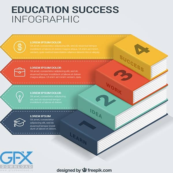 در این پست شاهد دانلود قالب اینفوگرافیک رایگان آموزشی با طرح کتاب می باشید که با فرمت EPS و JPG بر روی سایت جی اف ایکس دانلود به صورت کاملا رایگان برای دانلود بارگذاری شده است. این قالب به صورت لایه باز می باشد و مناسب جهت استفاده و ویرایش در نرم افزار ایلاستریتور است. خیلی ساده و راحت قادر به ویرایش و سفارشی سازی آن می باشید. این فایل اینفوگرافیک شامل 4 مرحله با طرح کتاب است که می توانید آن را مطابق سلیقه خود ویرایش کنید. فقط کافیه متن، رنگ و ... را تغییر دهید تا یک طرح زیبا و جذاب ایجاد کنید.