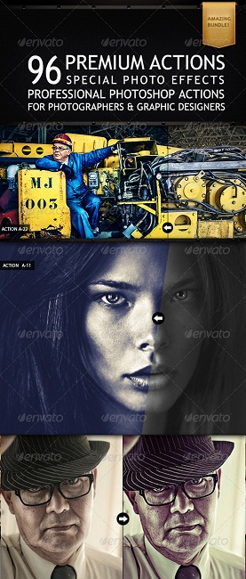 GraphicRiver Premium Actions 96 شامل 98 اکشن آماده فتوشاپ مخصوص آتلیه ها و عکاسان است. این اکشن فتوشاپ شامل افکت های زیبا مخصوص اعمال روی عکس می باشد• شامل 96 افکت زیبا قابل اجرا بر روی فتوشاپ CS4 به بالا