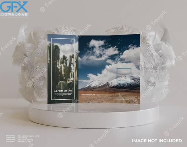 دانلود موکاپ لایه باز بروشور سه لت در کنار گل های سفید