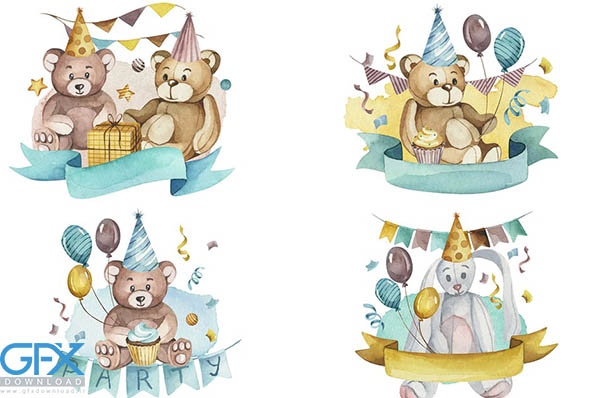 دانلود طرح لایه باز psd مجموعه عناصر آبرنگی مهمانی کودکانه