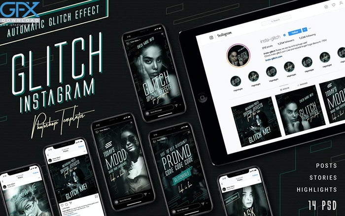 استوریها و پستهای اینستاگرام خود را با این قالبهای اینستاگرام جذاب کنید، خلاق و مدرن باشید! دانلود قالب های اینستاگرام لایه باز گلیچ به سبک سایبرپانک، با اشکال خودکار، فیلترهای اشکال. از عکسهای معمولی، پستها و استوریهای با افکت گلیچ را برای اینستاگرام خود ایجاد کنید. آسان است. جلوه گلیچ خودکار! فقط عکس خود را در یک شی هوشمند قرار دهید تا ایجاد شود. این روش سریع و آسان است. برای دانلود قالب های اینستاگرام لایه باز گلیچ از جی اف ایکس دانلود به ادامه مطلب مراجعه کنید.