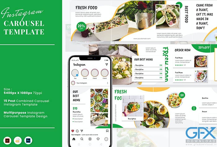 خیلی ساده و راحت قادر به ویرایش و سفارشی سازی این قالب لایه باز پست اینستاگرام Healthy Food Carousel خواهید بود. طرح از کیفیت بالایی برخوردار بوده و مناسب جهت ایجاد تصاویری با رزولوشن بالا می باشد. قابل ویرایش در نرم افزار فتوشاپ.