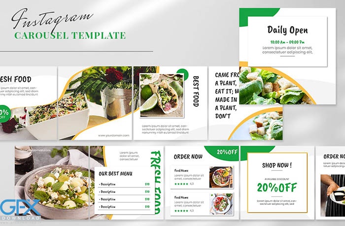 ارائه پست اینستاگرام به شکل کاروسل با موضوع غذای سالم برای تبلیغ کسب و کار شما. این مجموعه برای جذب فالوورهای شما، کسب درآمد از محتوای شما و هدایت ترافیک به وب سایت، فروشگاه و نمایه شما عالی خواهد بود. پست اینستاگرام لایه باز با موضوع غذای سالم با تغییر عکسها، متون، رنگها، ماکتها، نیاز خود را سفارشی کنید زیرا همه آنها قابل ویرایش هستند و به طور انعطافپذیری با بازاریابی مورد استفاده شما مطابقت دارند.