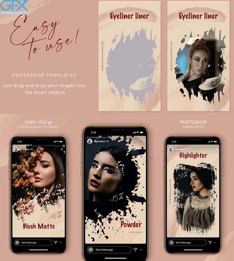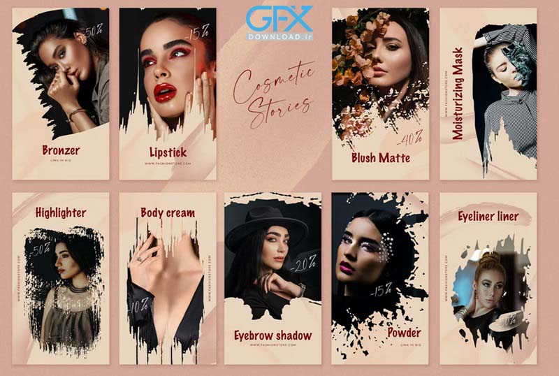 این مجموعه شامل 9 فایل PSD لایه باز فتوشاپ با ابعاد 1080×1920 برای ساخت استوری های اینستاگرام می باشد.شما می توانید برای ساخت بنرهای تبلیغاتی فروشگاه لوازم آرایشی، فروشگاه لوازم بهداشتی، سالن زیبایی، استودیو ناخن، سالن اسپا و...از این مجموعه استفاده کنید.فایل راهنما نیز درون فولدر موجود می باشد.