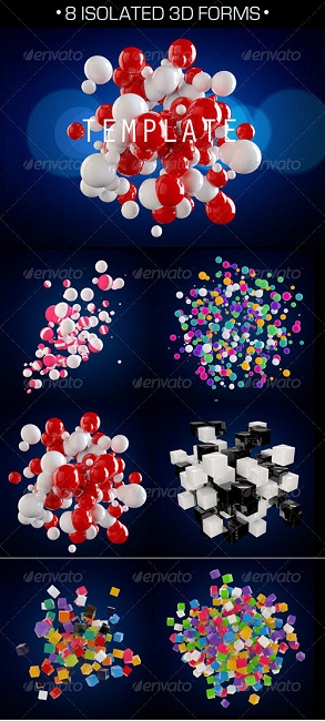 این مجموعه شامل 8 عنصر 3بعدی زیبا نظیر مکعب ، گوی ، بادبادک و ... است که به صورت PSD لایه باز ارائه میشود تا بتوان بدون محدودیت در جابه جایی آنرا در همه طرح های فتوشاپ به کار برد.