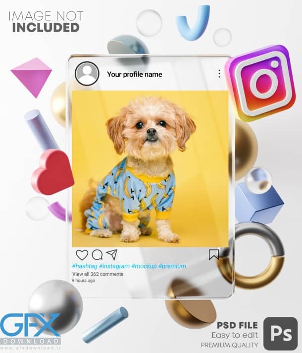 موکاپ لایه باز پست اینستاگرام شیشه ای برای نمایش مشخصات اینستاگرام روی قاب شیشه ای بین شکل های 3 بعدی مدرن در پس زمینه روشن است. توسط آن می‌توانید پست‌های اینستاگرام زیبایی برای رسانه اجتماعی ایجاد کنید. هم چنین می توانید به اسانی تصاویر خود و یا متن خود را در طرح ویرایش کنید و در اینستاگرام منتشر نمایید. طرح لایه باز پست اینستاگرام فریم شیشه ای به راحتی در نرم افزار فتوشاپ قابل ویرایش و سفارشی سازی است. از این موکاپ لایه باز برای اهداف تبلیغاتی می توانید استفاده کنید.