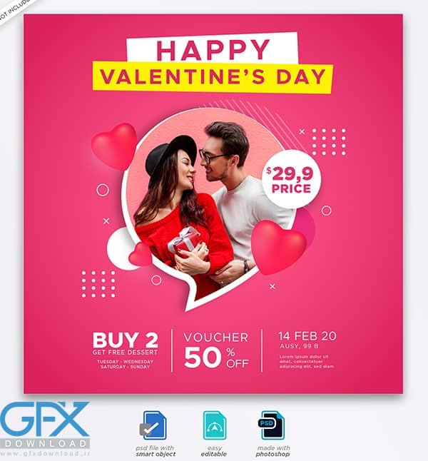 ویرایش و سفارشی سازی این قالب پست اینستاگرام ولنتاین بسیار آسان است. به راحتی تصویر و یا متن خود ا جایگزین کنید و یک طرح زیبا ایجاد کنید. این فایل به صورت Smart Object طراحی شده که در نتیجه فقط با چند کلیک قادر به جایگذاری تصاویر خود در این قالب آماده خواهید بود.