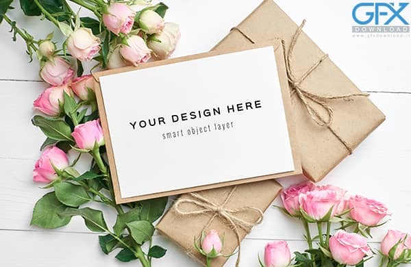 دانلود موکاپ کارت تبریک و دعوت لایه باز با گل و جعبه کادو