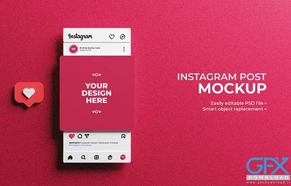 موکاپ لایه باز پست اینستاگرام مناسب برای پیج های فروشگاهی اینستاگرام ، جهت معرفی محصولات، خدمات و پیج خود یا برای سایر شبکه های اجتماعی دیگر می باشد. در این طرح شاهد دانلود موکاپ سه بعدی اینستاگرام با نوتیفیکشن قلب از مدل 3 بعدی برای پست رسانه های اجتماعی اینستاگرام می باشید. با استفاده از این موکاپ لایه باز فتوشاپ به راحتی میتوانید اسکرین پیج خود را جایگزین کنید و به نمایش بذارید. این محصول با فرمت PSD ارائه شده است که به راحتی در نرم افزار فتوشاپ قابل ویرایش است.