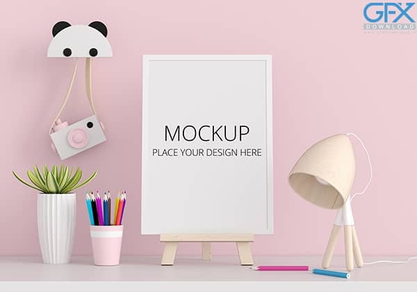 دانلود طرح موکاپ لایه باز قاب عکس روی سه پایه با لوازم مدرسه