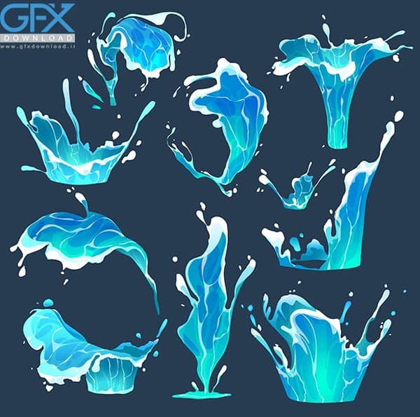 cartoon water splashes نام این مجموعه وکتور پاشیدن آب کارتونی می باشد که شامل انواع پاشش آب با طراحی کارتونی و زیبا است. فرمت این فایل وکتور EPS و AI می باشد که قابل ویرایش و اجرا در نرم افزار های ایلاستریتور و کورل به صورت لایه باز است. از این مجموعه می توانید در انواع طراحی های گرافیکی خود استفاده کنید. فایل وکتور بدون افت کیفیت قابلیت تغییر اندازه دارد.