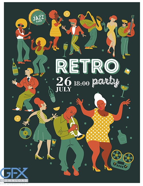 این طرح وکتور مناسب برای جشنواره موسیقی پوستر ، مهمانی ها با سبک دهه 70 ، 80. مجموعه ای بزرگ از کاراکتر ها ، نوازندگان ، رقاصان و خوانندگان می باشد. وکتور رایگان پوستر جشنواره موسیقی سبک قدیمی با فرمت EPS ارائه شده است که قابل ویرایش و سفارشی سازی در نرم افزار ایلاستریتور است.