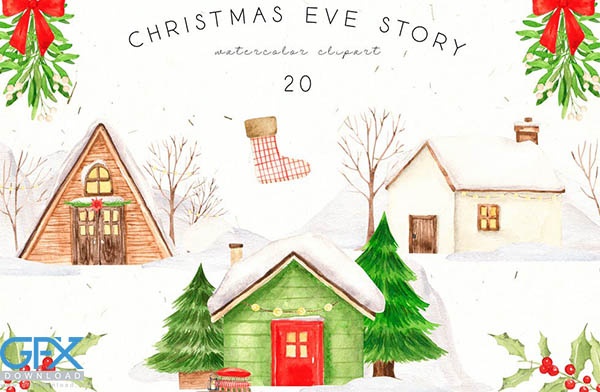 دانلود وکتور کلیپ آرت آبرنگی درختان و خانه های کریسمس