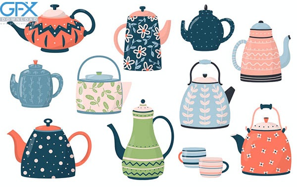 مجموعه وکتور ظروف کتری و قوری چای Collection of Teapots and Kettles در رنگها و طرح های مختلف. وکتور مجموعه قوری و کتری مجموعه ای از قوری و کتری جدا شده در پس زمینه سفید. ظروف سرامیکی نوشیدنی یا ظروف شیشه ای برای مراسم چای می باشد. وکتور کارتونی با طراحی فلت. شامل 1 فایل EPS 10 با نماد روی آن. 1 فایل AI با نماد روی آن.