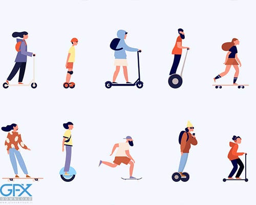 وکتور کاراکتر های مرد و زن اسکیت بورد سوار ، افراد سوار بر اسکیت بورد، با مفهوم لانگ برد و حمل و نقل شخصی مدرن شامل 10 طراحی تصویر در یک فایل طراحی 100% وکتور. این فایل وکتورها کاملا قابل ویرایش و قابل مقیاس پذیری مجدد، طراحی و المان و چاپ با کیفیت بالا.