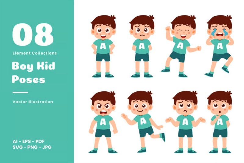 4- وکتور لایه باز شخصیت کارتونی پسر بچه با ژست های مختلف برای طراحی گرافیکی