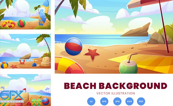 این وکتور بک گراند ساحلی با فرمت های Ai، PDF، EPS و JPG ارائه شده است که قابل ویرایش و استفاده در نرم افزار ایلاستریتور به صورت لایه باز است.