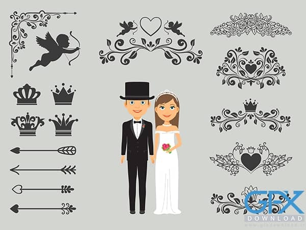 با دانلود وکتور رایگان عناصر عروسی از آن برای طراحی کارت دعوت عروسی، تولد، طرح های عاشقانه و ... استفاده کنید. این مجموعه شامل المان های زیبایی مثل پیکان با طرح قلب، تاج، طرح های گل و بوته و غیره است.