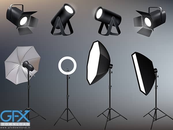در این فایل وکتور شاهد مجموعه ای کامل از تجهیزات آتلیه عکاسی پروژکتور نورپردازی لوازم عکاسی می باشید. با دانلود وکتور لوازم نورپردازی آتلیه می توانید از آنها در طراحی های گرافیکی و تبلیغاتی استفاده کنید و کیفیت کارهای خود را بالا ببرید. این فایل شامل انواع لوازم نورپردازی مثل نورافکن، نور پشت صحنه و غیره می باشد. فرمت این فایل eps می باشد که قابل اجرا و ویرایش در نرم افزار اسلاستریتور و کورل است.