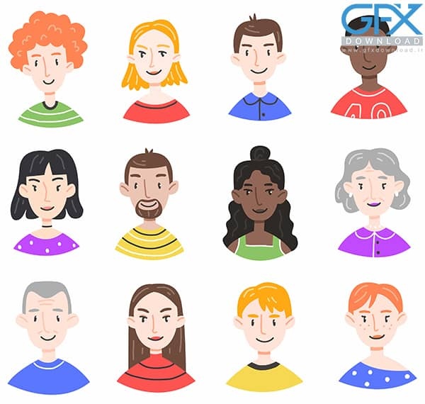 امجموعه ای با پرتره های افراد مختلف به سبک کارتونی زیبا که روی پس زمینه سفید قرار گرفته است. دانلود وکتور صورت و چهره پسر از صورت زنان و مردان به سبک کارتونی بسیار با کیفیت و زیبا طراحی شده اند و در فرمت AI برای نرم افزار Adobe Illustrator ساخته شده اند. این وکتور های زیبا می توانند در انواع طراحی های تبلیغاتی و امور گرافیکی مورد استفاده قرار بگیرند. برای دانلود وکتور صورت با لینک مستقیم از جی اف ایکس دانلود به ادامه مطلب مراجعه کنید.