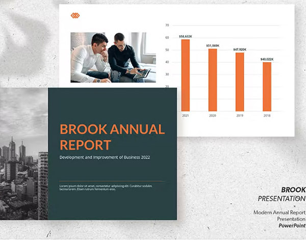 دانلود قالب پاورپوینت گزارش عملکرد سالانه Brook یک قالب آماده برای گزارش سالانه می باشد که یکی از مهمترین اسناد تجاری است که معمولاً برای گزارش عملکرد کلی شما در طول سال استفاده می شود. شما می توانید این ارائه را با استفاده از این قالب پاورپوینت گزارش سالانه Brook، ارائه گزارش سالانه خود را ایجاد کنید. این قالب به طور ویژه طراحی شده است. ترکیب رنگی جذاب از سفید، سبز و نارنجی با کمی رنگ مایل به خاکستری دارد