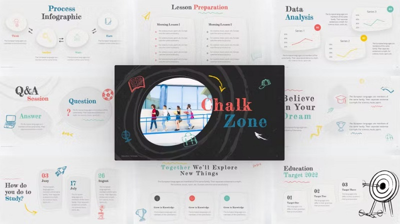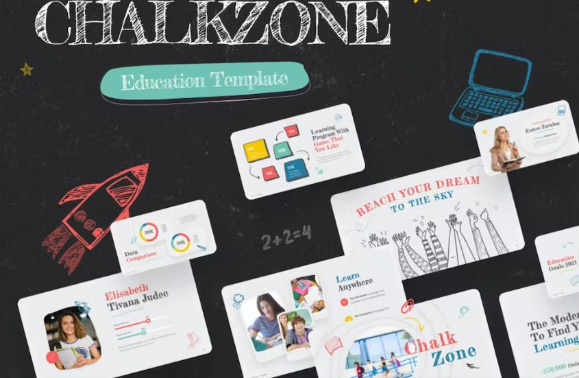 Chalkzone Doodle نام این تم پاورپوینت تخته سیاه با طراحی خلاقانه، ساده، مینیمال و سبک Doodles می باشد. این قالب مناسب برای ارائه های درسی، دانش آموزان، معلم ها، شرکتی و شخصی است.