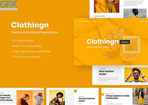 همچنین شما می توانید تصاویر خود را فقط با چند کلیک و بدون نیاز به دانش نرم افزارهای جانبی مانند فتوشاپ در این قالب ها جایگذاری نمائید، متن را وارد کنید و ارائه شما آماده است. دانلود تم پاورپوینت لباس Clothingn به شما در انتقال مطالب کمک می کند تا ارائه جذاب تری داشته باشید. • 40 اسلاید برتر
