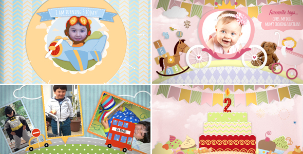 از این پروژه افتر افکت می توانید برای ساخت اسلایدشو عکس کودک-جشن تولد کودک-معرفی نوزاد جدید و...استفاده نمایید .پروژه شامل 2 ورژن مختلف برای پسر و دختر می باشد همچنین پروژه ای اختصاصی جهت دعوت از خویشاوندان و دوستان به جشن تولد نیز در این مجموعه موجود می باشد