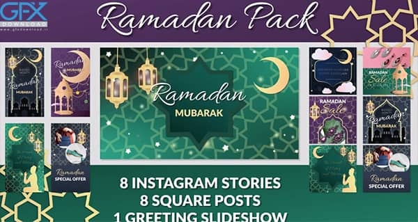دانلود پروژه افتر افکت پکیج ماه رمضان یک بسته کامل مناسب برای ماه مبارک رمضان شامل مجموعه ای از 8 استوری اینستاگرام ماه رمضان، 8 قالب پست اینستاگرام مربعی شکل برای شبکه های اجتماعی و 1 اسلایدشو برای معرفی یا تبلیغات می باشد. یک قالب آماده ویدئویی با تصاویر رنگارنگ در موضوع تعطیلات عید فطر و رمضان است. از آن برای تبریک تعطیلات ماه رمضان به مخاطبان خود ، افزایش مخاطبان فروشگاه خود از طریق تبلیغات و ارسال تبریک به عزیزان خود استفاده کنید. این پروژه شامل 8 استوری ، 8 پست و 1 اسلایدشو است. این محصول با 57 متغیر متنی و 8 متغیر رسانه ای قابل ویرایش است بدون نیاز به پلاگین.