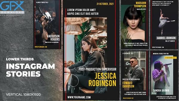 یک قالب مدرن که شامل 6 استوری منحصر به فرد طراحی شده و متحرک در اینستاگرام است. می توانید از آنها برای ایجاد ویدیوهای جالب اینستاگرام ، فیس بوک ، یوتیوب استفاده کنید. محصولات ، پست های وبلاگ خود را تبلیغ کنید ، افکار خود را به اشتراک بگذارید ، نقل قول های الهام بخش ، سرگرم کننده و حقایق مفید. با این پروژه پریمیر Instagram Stories Lower Thirds شیک و متحرک ، مخاطبان خود را تحت تأثیر قرار دهید.