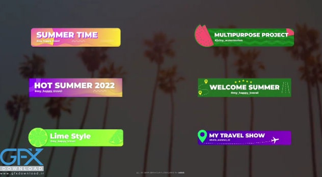 با استفاده از پروژه آماده پریمیر Lower Thirds: Summer کیفیت کلیپ و تیزر های خودرا بالا ببرید. میتوانید به راحتی فایل اصلی را مطابق با نیاز های خود ویرایش کرده و کیفیت پروژه خود را بالا ببرید. دانلود پروژه آماده پریمیر 6 تایتل زیرنویس تابستانی
